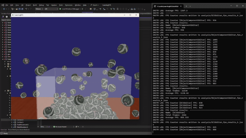 Proyecto en C++ con OpenGL que compara las arquitecturas Object-Component y ECS implementando la misma simulación de físicas. Se analiza el rendimiento, memoria y organización del código en ambos enfoques.
